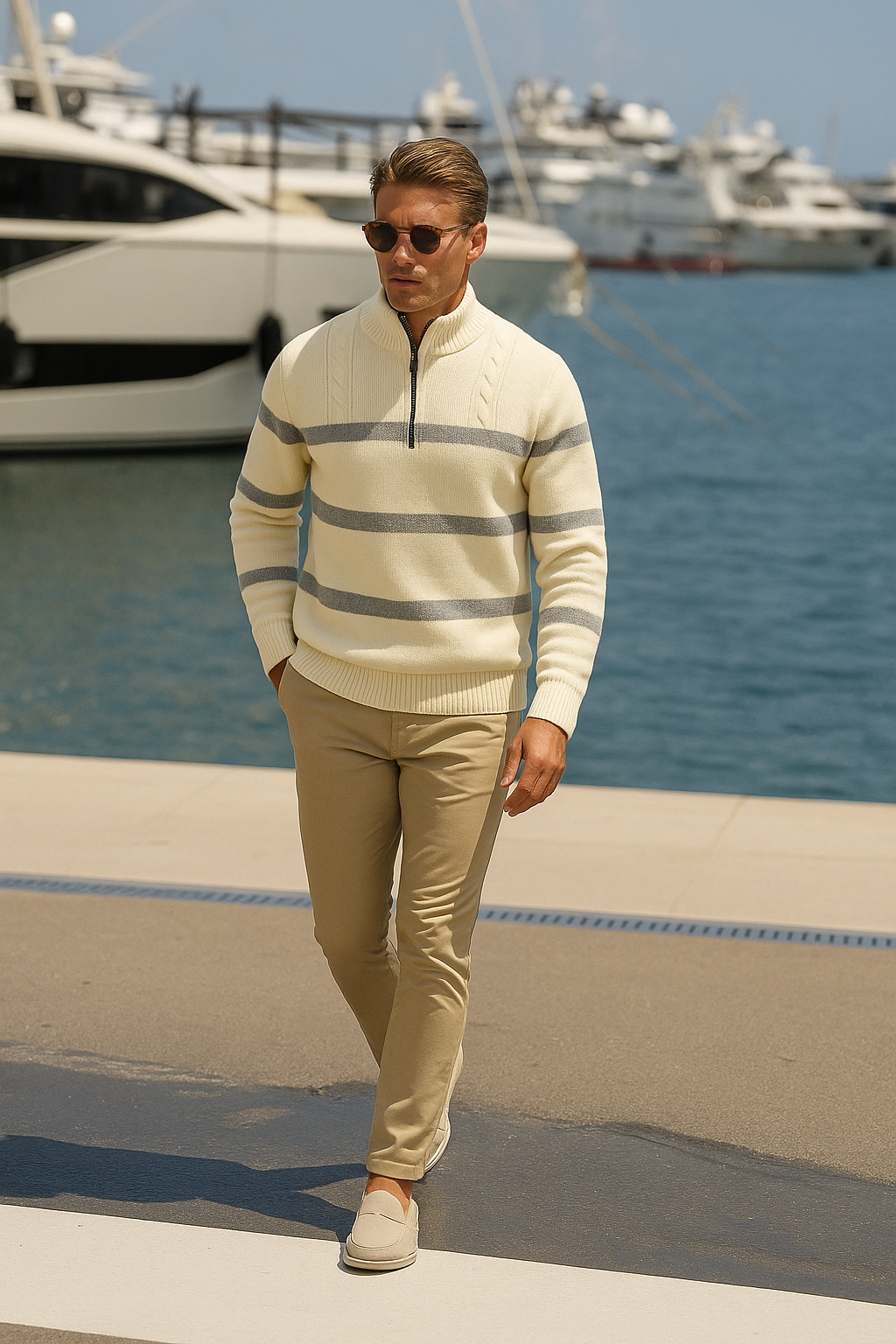 This knitted sweater combines a soft cream tone with contrasting gray stripes for a subtle yet distinctive look. The half-zip neckline introduces a modern detail, offering easy layering and a relaxed feel. Designed with everyday versatility in mind, it works well in casual settings throughout the cooler months.