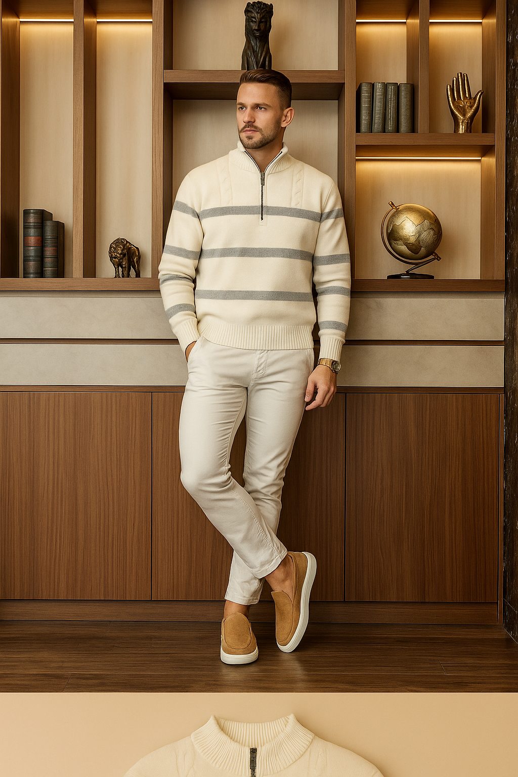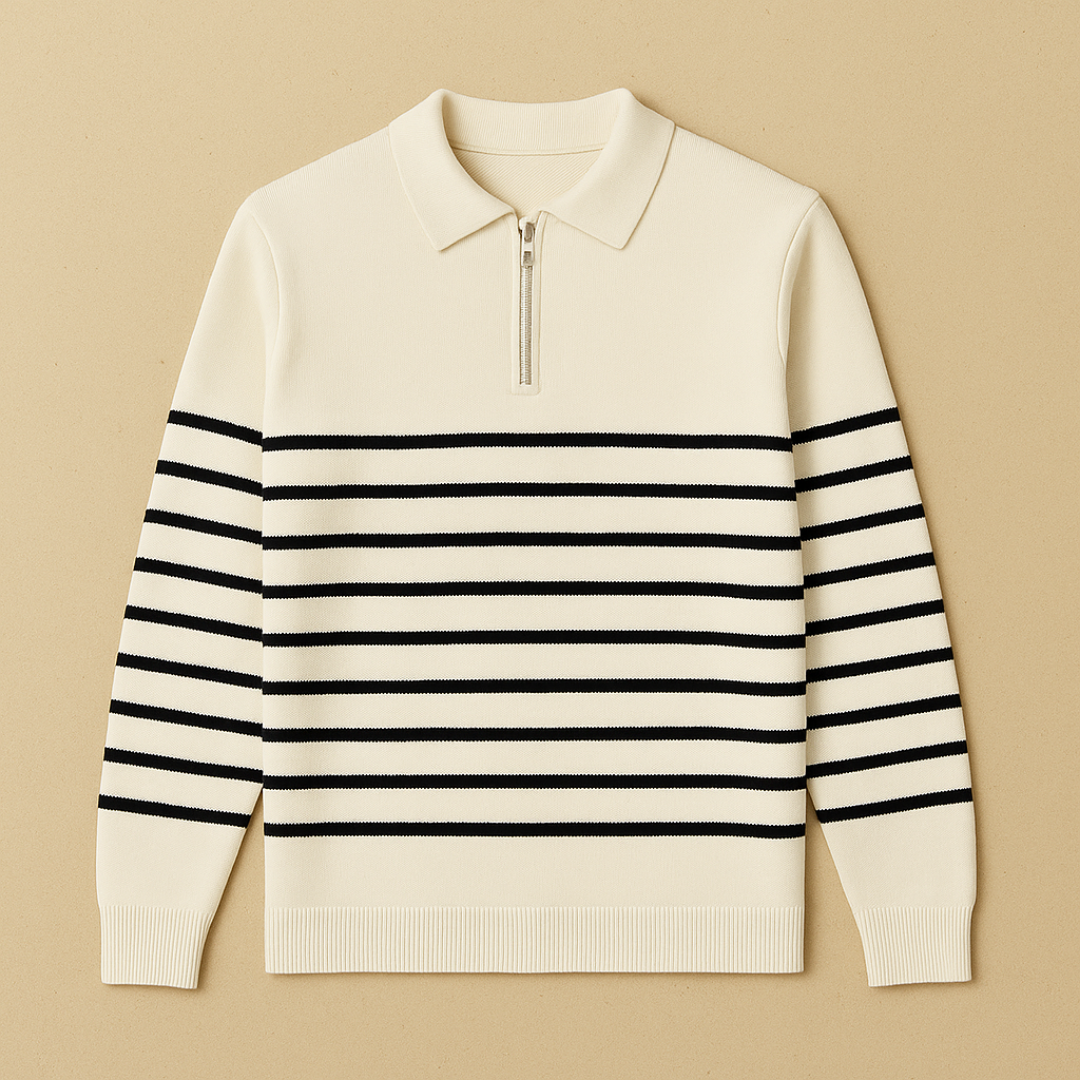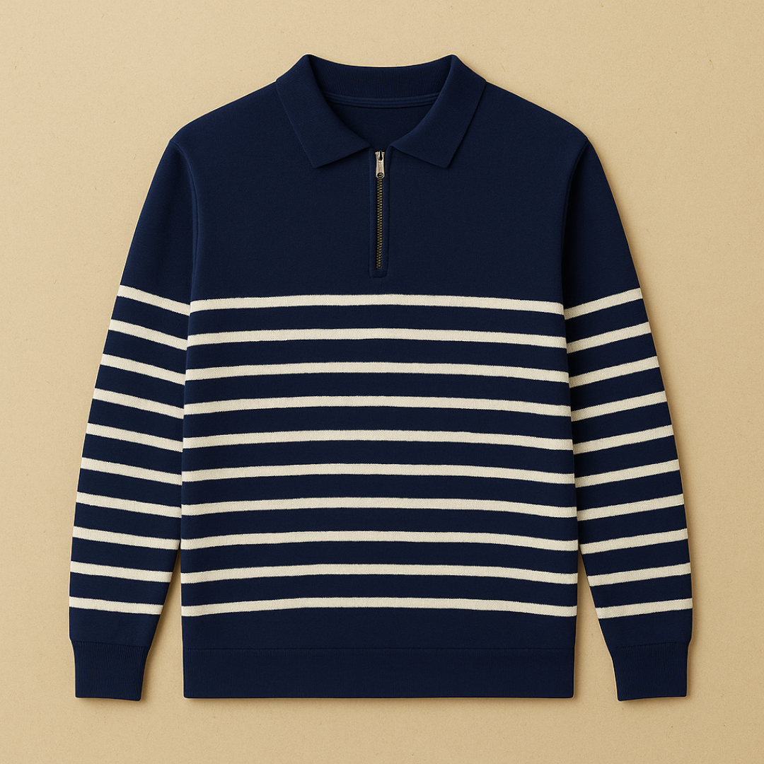 This half-zip sweater combines a subtle nautical influence with a clean, modern cut. The knit texture and structured stripe pattern offer a relaxed yet refined feel. Designed with a minimalist collar and half-zip closure, it suits both laid-back settings and more polished casual looks.